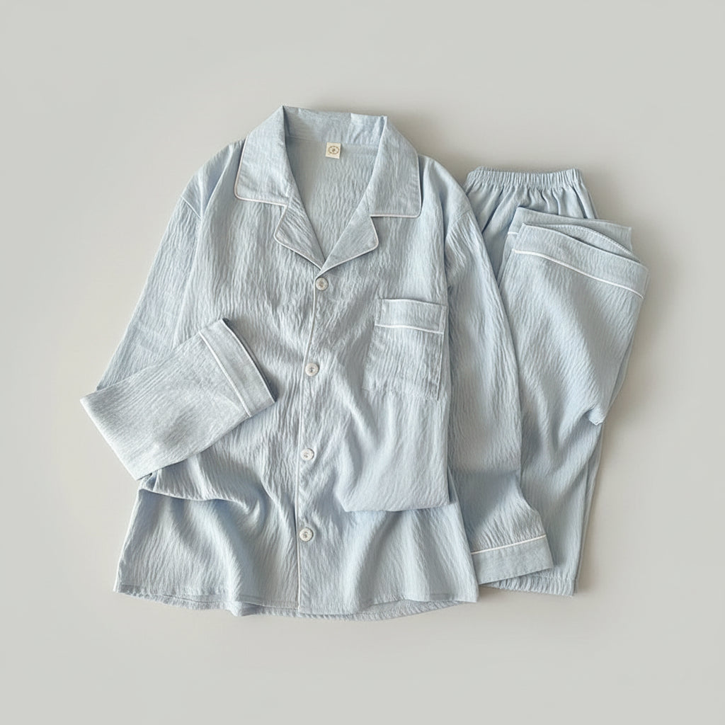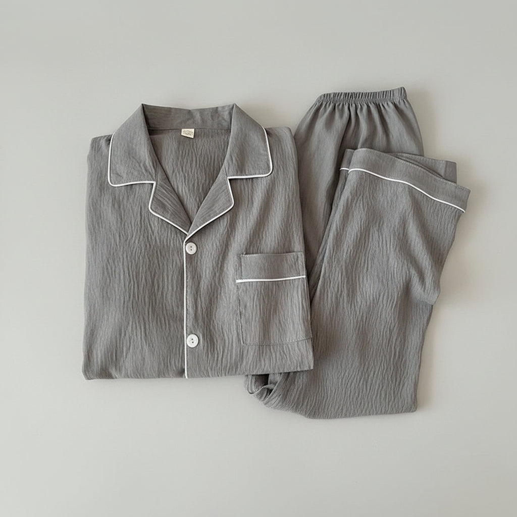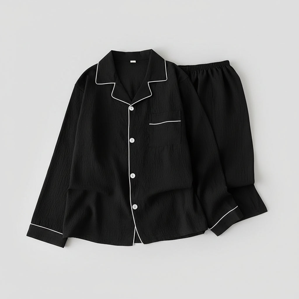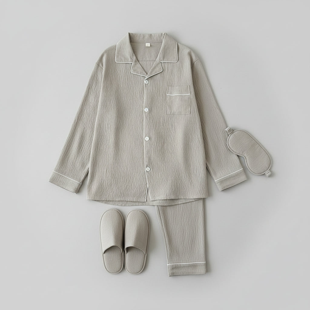 Warm and cozy men’s pajama set made from thick, soft polyester. It features a turn-down collar, full sleeves, a button-up top, and elastic waist bottoms for a comfortable fit. With its simple solid design and relaxed style, it’s perfect for staying comfortable during colder nights.
